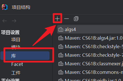 选择 文件(File) -> 项目结构(Project Construct) -> 库(Library) -> 左上方加号