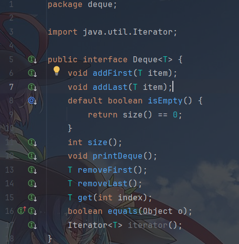 通过接口文件,只需要考虑实现哪些方法,创建 接口文件,放入要实现的 方法名 及 类型 ,如 interface Deque<T>,具体实现由 类 完成,使代码更加标准化。在类中,通过 implements 调用 (implements Iterable<T>, deque.Deque<T>